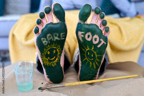 Barefoot Day, green painted soles of feet with words 'bare foot' and a smiling sunflower and sun painted in yellow.