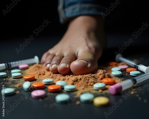 Barefoot surrounded by pills and syringes, symbolizing struggle with addiction. Anti drug day