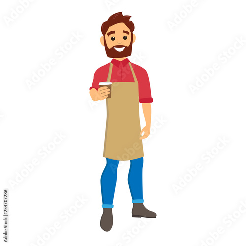 Barista giving coffee to go. Young man with a beard and an apron. Character vector illustration