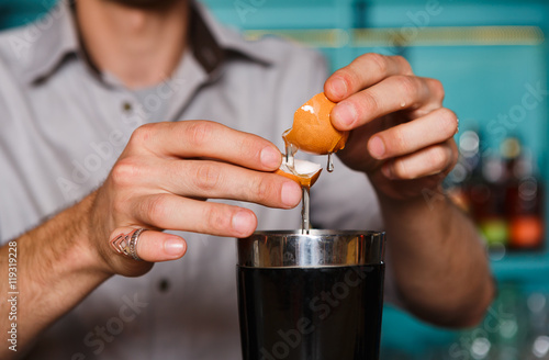Barman's hands making cocktail with egg yolk