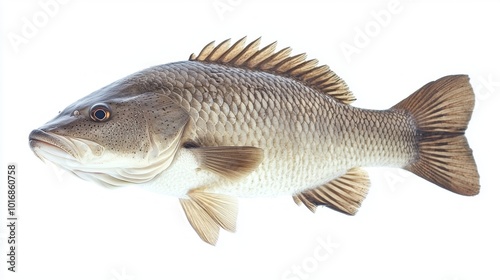 Barramundi a species known for its culinary appeal is displayed against a white background highlighting its scale patterns and body structure.