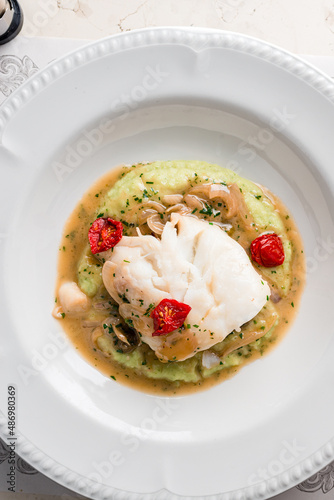 Barramundi or pangasius fish and meat steak with vegetable in plate Healthy food style