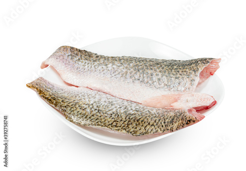 barramundi or seabass fish sliced with dish isolated on white background ,include clipping path