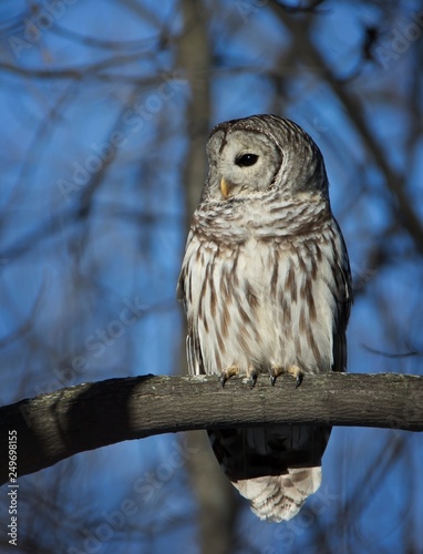 Barred Owl on tree branch in winter sunlight