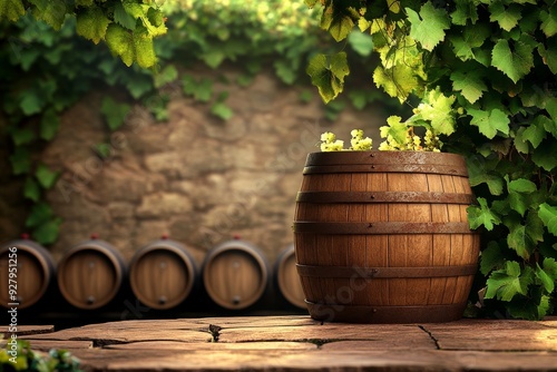 Barrels stacked in winery setting with copy space for logo, castle like ambiance