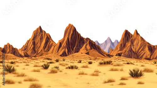 Barren desert landscape with rugged mountain peaks, isolated on transparent background