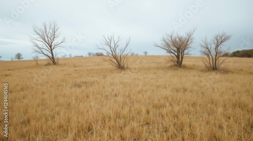 Barren Landscape with Dry Grass and Leafless Trees Under Gray Sky