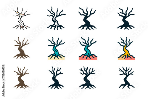 Barren Tree Logos. Set Logo of Barren Tree: Twisted Tree with Exposed Roots. Logo set in vector style, emblematic variations. line
