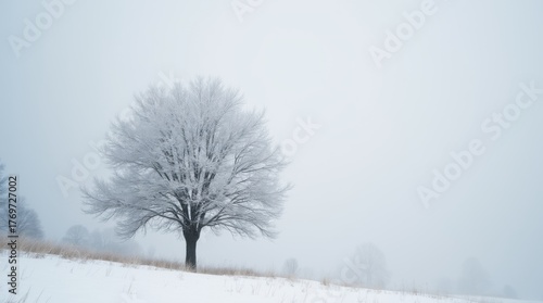 Barren winter landscape with a single frozen tree against a grey sky.