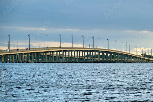 Barron Collier Bridge and Gilchrist Bridge in Florida with moving traffic. Transportation infrastructure in Charlotte County connecting Punta Gorda and Port Charlotte over Peace River