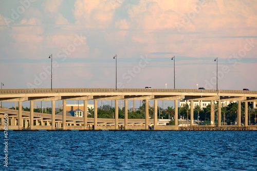 Barron Collier Bridge and Gilchrist Bridge in Florida with moving traffic. Transportation infrastructure in Charlotte County connecting Punta Gorda and Port Charlotte over Peace River