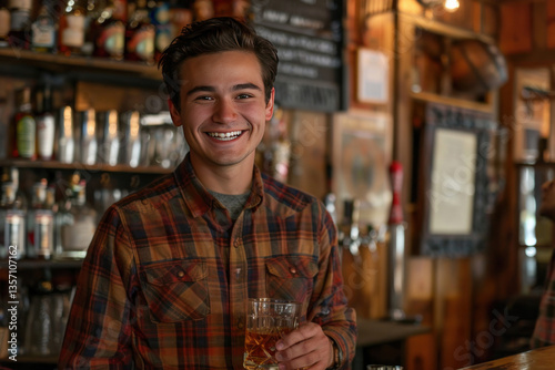 Bartender holding a whiskey glass with a smile, friendly and approachable tone