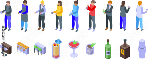 Bartender making cocktail icons set. People drinking and having fun at the counter, bartenders preparing cocktails and serving drinks
