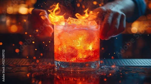 Bartender serving flaming cocktail on glowing bar counter.