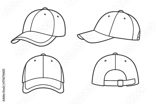 Baseball cap outline vector illustration set. Headwear from various angles: front, back, and side view. Minimalist line art design for mockup or fashion template.