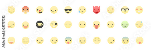 Basic face emojis, emoticons, emotions flat vector illustration symbols. Hands, faces, feelings, situations, shy, embarrassed, smile, mood, joke, lol, laugh, cry, happy, smileys icons