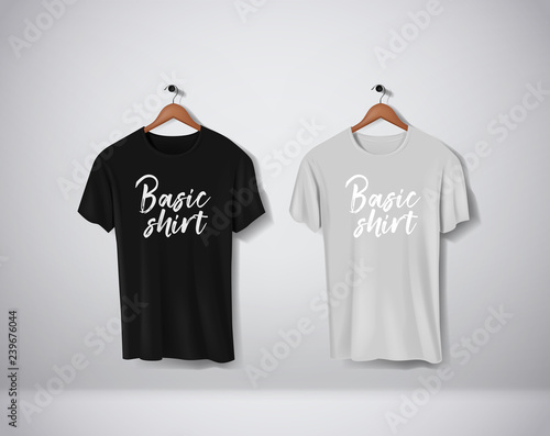 Basic T-Shirts collection. Black and gray Mock-up clothes set hanging isolated on wall. Front side view with lettering for your design or logo.