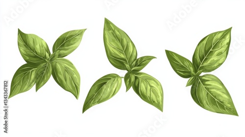 Basil leaves isolated on white background. Set, collection of different position basil green fresh leaves. Healthy eating, aromatic herb, food ingredient, spice for culinary