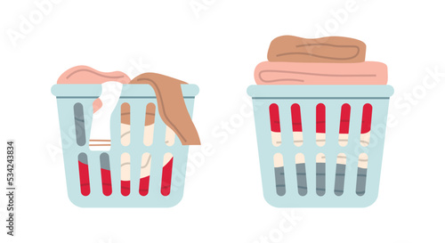 Basket with dirty and clean clothes. Laundry basket. Pile of clean folded clothes. Washed laundry. Pile of different clothes. Laundry for washing. Flat vector isolated illustration.