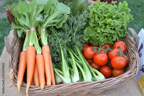 Basket with fresh vegetables from farmer market, including carrots, tomatoes, lettuce. Generative AI