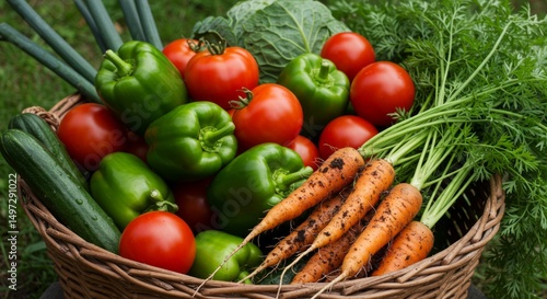 Basket with freshly harvested produce tomatoes, peppers, carrots, and greens
