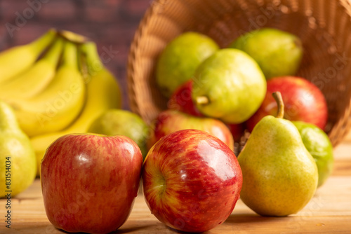 Basket with fruits on rustic wooden surface and dark background, selective focus.