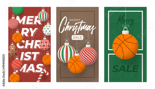 basketball Christmas Greeting grainy card. Merry Christmas and happy new year sport retro greeting card. Hang on a thread xmas ball bauble