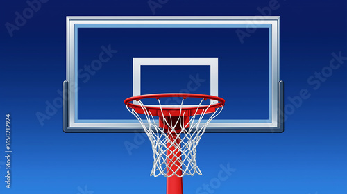 Basketball hoop and backboard are seen against a gradient blue background