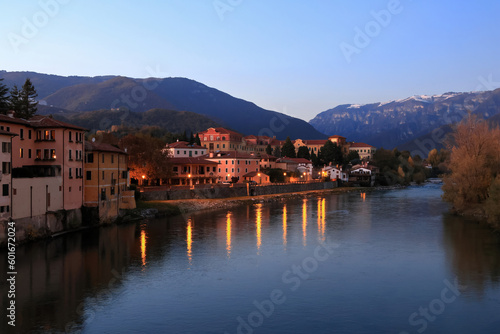 Bassano del Grappa. Sunset on the river Brenta from Ponte Vecchio (or "Ponte degli Alpini")