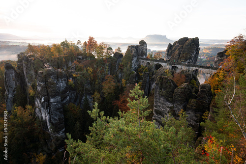 Bastei Brücke im Herbst in der Sächsischen Schweiz mit Nebel