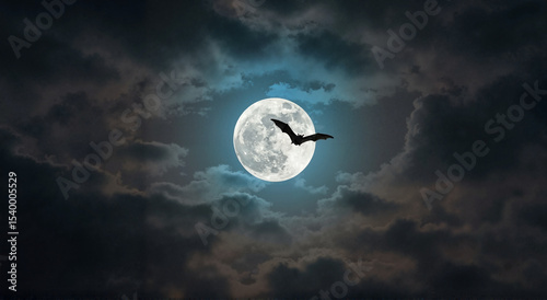 Bat flying across full moon in cloudy night sky, halloween concept