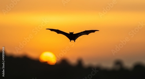 Bat Silhouette at Golden Hour Sunset - A lone bat in silhouette soars against a vibrant golden hour sunset, symbolizing freedom, mystery, twilight, transition, and the nocturnal world