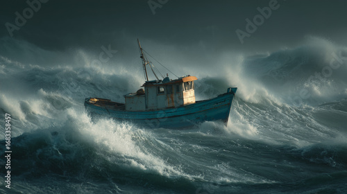 Bateau de pêche luttant contre de fortes vagues lors d'une tempête sur l'océan