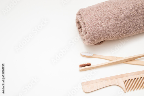 Bath and home accessories. Towel, bamboo toothbrush and comb. Zero waste. Beauty and SPA concept. Free space