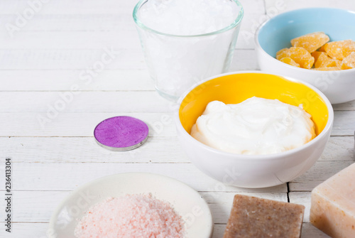 bath salts, beeswax , makeup base, powder compact, soaps and cosmetic creams on white wooden background