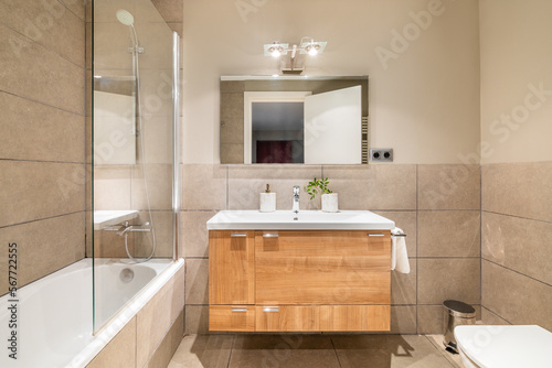 Bathroom in beautiful beige color. Vanity top sink with wooden drawers. Bathtub is fenced with protective glass from splashes. Front door is reflected in square large mirror opposite.