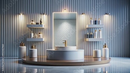 Bathroom interior with stand-podium for cosmetics on abstract light background, bathroom, interior, stand-podium
