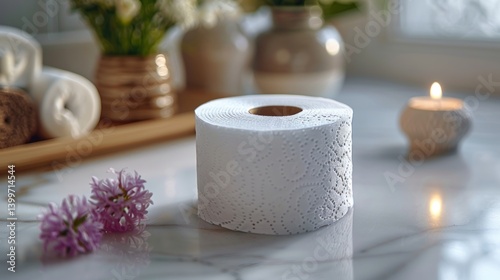 Bathroom tissue roll on marble countertop with flowers, candles, and towels