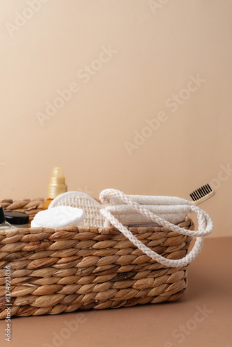Bathroom tools and organic cosmetic products in woven basket on beige background emphasizing natural, eco-friendly beauty essentials and self-care routine concept