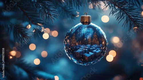 Bauble reflecting a Christmas tree, hanging from a fir branch with gift boxes below. Blue bokeh lights fill the abstract night sky, creating a dreamy holiday atmosphere.