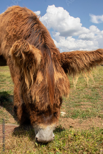 Baudet du Poitou - Equus asinus - broutant de l'herbe dans la prairie, vu de face