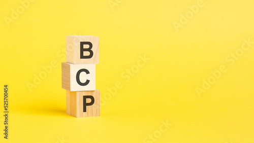BCP - Business Continuity Plan - text on wooden block with yellow backgrounds.
