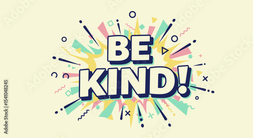 BE KIND! Inspirational message in a vibrant comic book style. Retro pop art typography with colorful explosion background. Positive quote for motivation and encouragement.