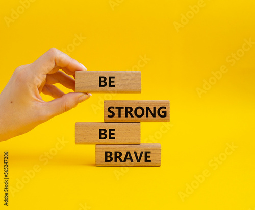 Be strong be brave symbol. Concept words Be strong be brave on wooden blocks. Beautiful yellow background. Businessman hand. Business concept. Copy space.