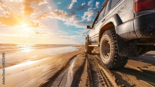 Beach Adventure. Rear View of Off-Road SUV in Sunlight