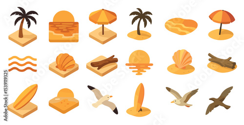 Beach and summer 3d icons set – isometric, vacation, seaside relaxation symbols