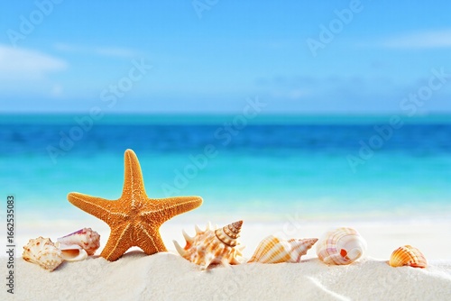 Beach Background Seashells Starfish on Sandy Beach with Turquoise Ocean Background Summer Vacation