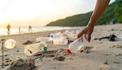Beach cleanup, plastic bottles