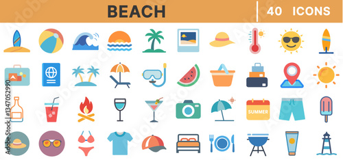Beach Color Icons Set – Summer, Vacation, Travel, Surfing, Sunbathing, Tropical, Holiday, Ocean, Palm Tree, Sunglasses, Swimming, Relaxation, Outdoor Activities