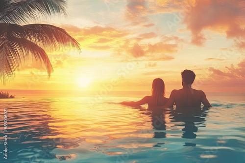 beach holidays for couple in luxury hotel, banner background with copyspace, man and woman relaxing near swimming pool at sunset , ai